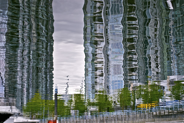 There are often instances in our everyday lives when the physics concept of light reflection and refraction can be observed. This photograph provides just that opportunity. The modern skyscrapers that occupy downtown Vancouver, BC are reflected by the waters of False Creek. Instead of a simple mirror image, the rippling and movement of the water itself creates a visually intriguing texture and adds to the artistic composition of the photo. From a physics standpoint, the incident rays from the buildings in the foreground travel towards the water and bounce off the surface at a myriad of different angles which correlate to the undulation of the liquid?s surface. The rays of light, having all been refracted at different angles, travel towards the camera and are captured. The result is an artistic photograph reminiscent of surrealism which the viewer is able to appreciate as being a sight which seems familiar, yet amiss.