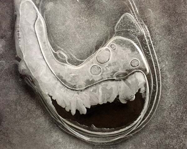This photo is of a flowing creek whose surface froze in layers. This particular location was near the bank under a bridge where large rocks about the size of basketballs impacted the flow of the water around it. The shape of the bubbles captured in the ice shows the direction of the current. The slow phase change beautifully displayed how cool physics can occur naturally. The ice formed was about an inch thick, yet each individual frozen layer was about a millimeter thick. The picture was taken from above at a height of about one foot, straight down, nearly perpendicular to the surface in attempt to capture some of the many layers. The overall area captured by the picture is approximately one square foot. The amount of detail and sheer size of this ice bubble formation is what made it so spectacular. What I love about this is the level of variation and uniqueness that can result in physics when you least expect it to. Even things such as phase change that seem so simple can yield a unique, complex result.