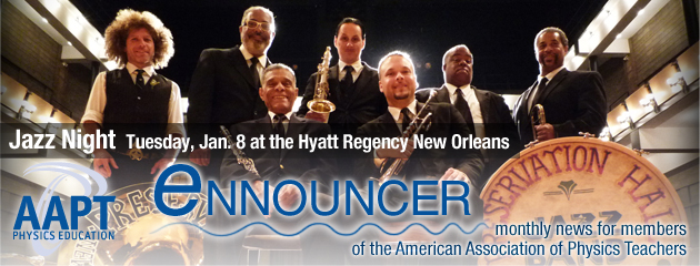 AAPT's eNNOUNCER is a service to members of the American Association of Physics Teachers and is produced by the AAPT Executive Office. Other stories of significance appear in our Announcements Archive and our archive of Press Releases. E-mail suggestions, news items, comments, and unsubscribe requests to: aapt-news@aapt.org.